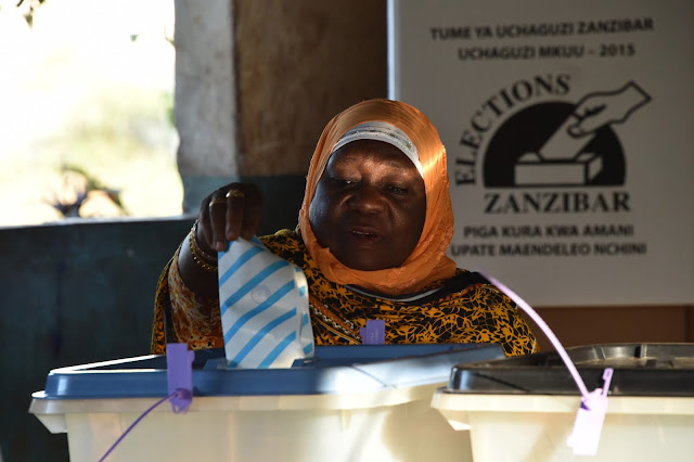Mke wa Rais wa Zanzibar na Mwenyekiti wa Baraza la Mapinduzi Mama Mwanamwema Shein akitumbukiza kura katika kituo cha kupigia kura cha Skuli ya Bungi msingi wilaya ya kati Mkoa wa Kusini Unguja,